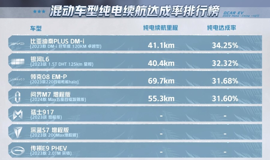 而此次引发争议的则在纯电续航测试。在所有能够参加该类测试的车型中,纯电达成率由低至高的前三名分别是问界M7增程版、领克08EM-P、银河L6,纯电达成率分别为31.60%、31.68%、32.32%。