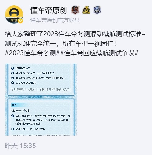 12月10日15时35分,懂车帝官方发布了冬测混动续航测试的标准,并表示测试标准完全同意,所有车型一视同仁。