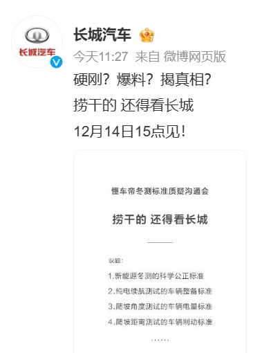 12月11日上午,长城汽车官方微博发文称将在12月14日15时召开“懂车帝冬测标准质疑沟通会”。