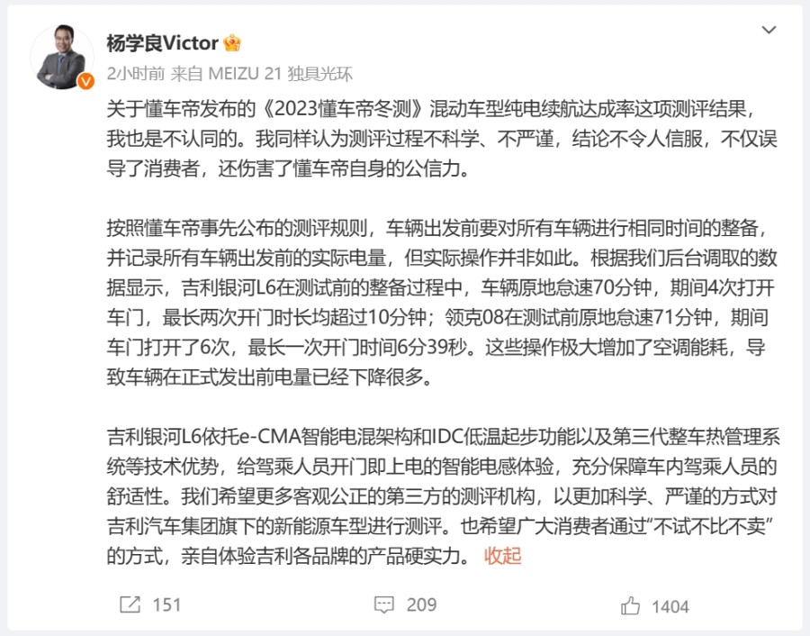 当日下午,吉利集团高级副总裁杨学良泽也发微博称对该项测评结果不认同,认为其测评过程不科学、不严谨,结果不令人信服,不仅误导消费者,还伤害其自身公信力。