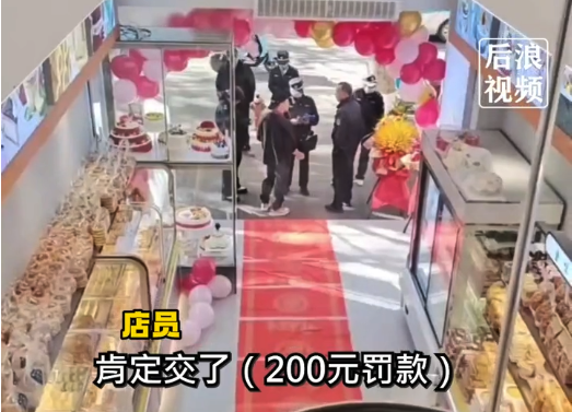 12月11日,云南曲靖,一家蛋糕店开业在门口摆放花篮,结果一群城管上门,要对蛋糕店进行罚款。店员表示,执法人员说这是当地刚下来的新政策,摆花篮要提前报备,否则就要罚款,不交他们就不走。最终店员无奈交了200元罚款。