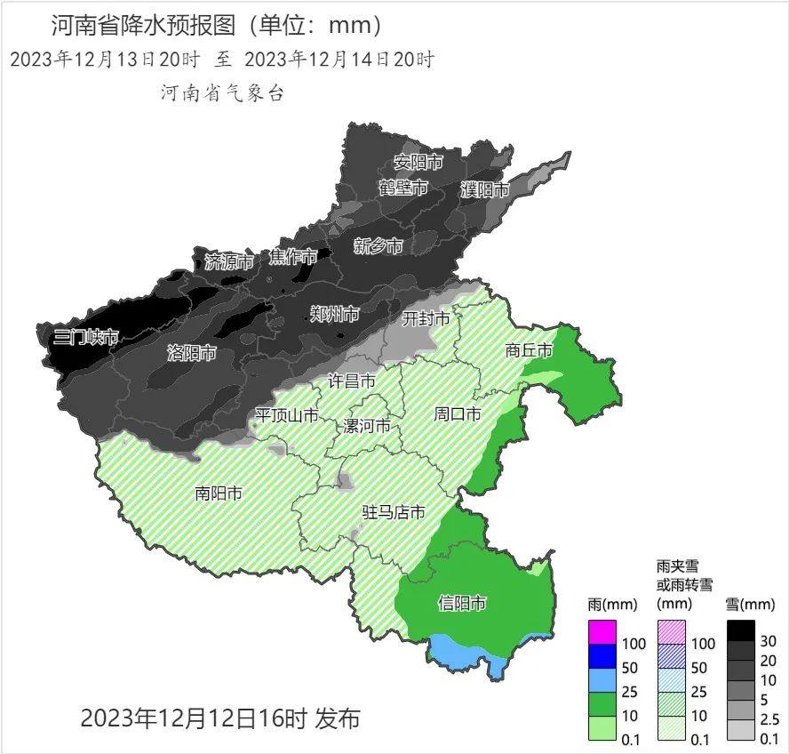 13日,全省阴天,淮河以北有雨夹雪或小到中雪,其中黄河以北、三门峡、洛阳、郑州西部局部大雪或暴雪,部分县市伴有冻雨;其他县市有小到中雨。