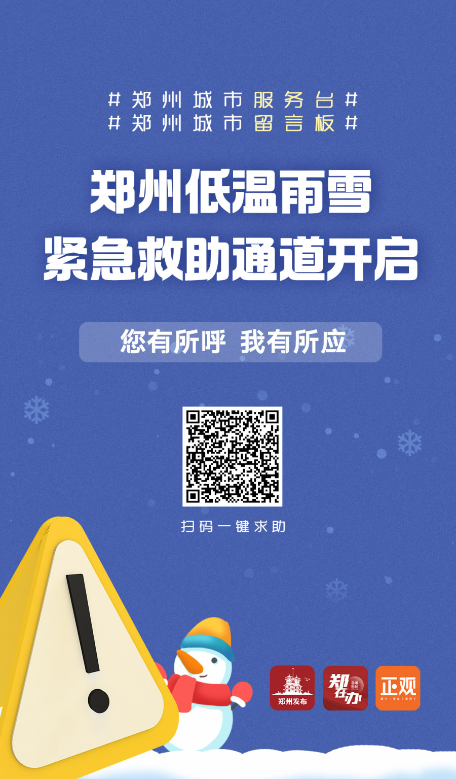望周知!郑州低温雨雪天气紧急救助通道开启