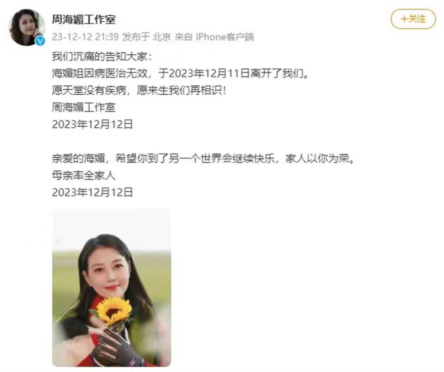 周海媚工作室发布讣告(周海媚工作室微博截图)