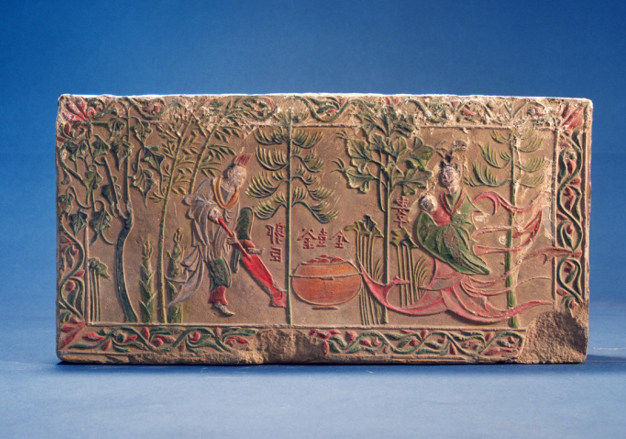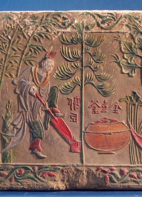这块砖表面光滑坚硬,彩色部分由多种颜色填涂而成,画面内容为“郭巨埋儿得金”的故事。画上的树木郁郁葱葱,郭巨位于画面左侧,在做挖土的动作,郭巨之妻则环抱幼儿站于右侧,衣衫飘动、艳丽夺目,无论是发髻还是服饰都神似《洛神赋》中的洛神。两人中间有一釜黄金,上面有“金壹釜”三字。整个画面温馨愉悦、轻松自然,没有原故事的悲剧与残酷,若非砖上文字的提示,很难看出这是《二十四孝》中的“郭巨埋儿”。