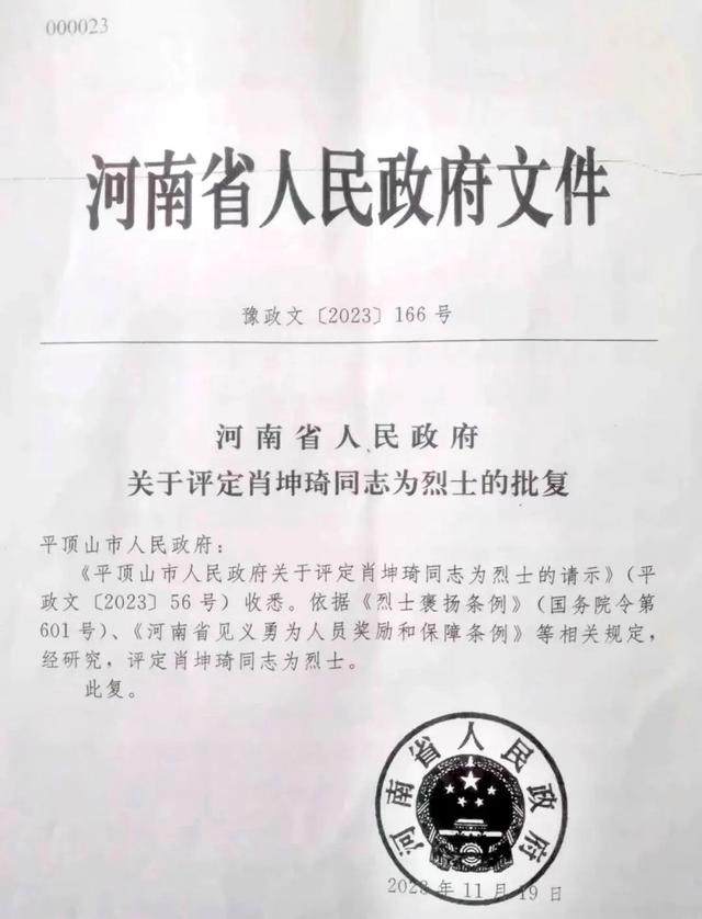 评定肖坤琦同志为烈士