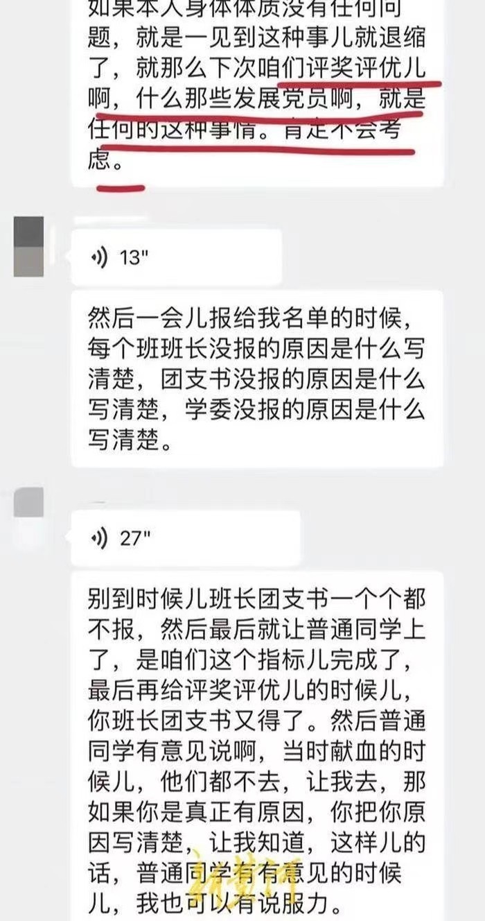 好吧,没有强制,但也没说不挂钩对吧?献血是光荣的,这毋庸置疑,但献血也必须遵循自愿原则。辅导员站在道德制高点上,指责学生献血不积极,这不就是道德绑架吗?班干部、积极分子要有敢为人先的思想觉悟,但如果只是被推着走,里面又能有多少真情实感呢?评优评先,入党筛选,衡量的标准都应该是学识和品德。按照辅导员的逻辑,身体较差的学生,难道就没资格评选了吗?