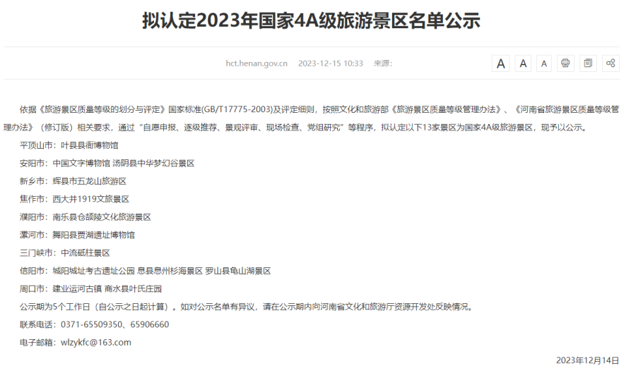 12月15日河南省文旅厅消息,拟认定13家景区为国家4A级旅游景区,包括: