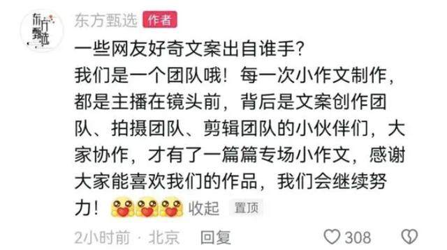 小编称,经典小作文背后是文案创作团队、拍摄团队、剪辑团队共同完成,非全部出自董宇辉之手。这句回复惹怒了不少董宇辉的粉丝,认为这是在“背刺”董宇辉。