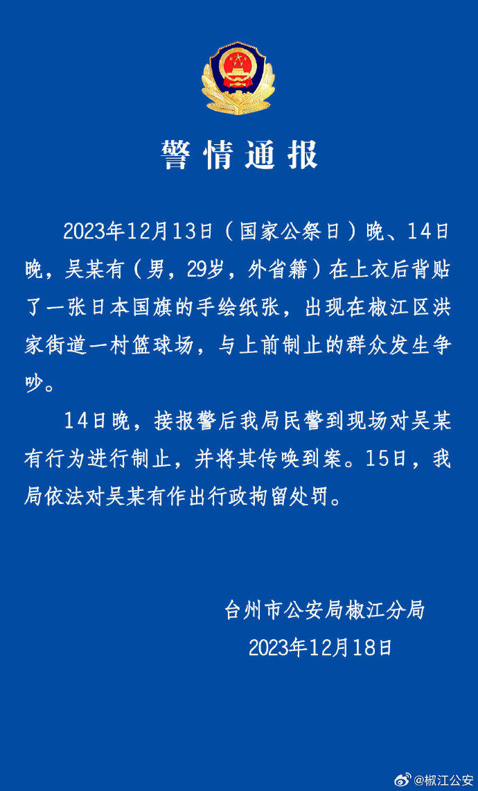 据浙江台州@椒江公安通报:2023年12月13日(国家公祭日)晚、14日晚,吴某有(男,29岁,外省籍)在上衣后背贴了一张日本国旗的手绘纸张,出现在椒江区洪家街道一村篮球场,与上前制止的群众发生争吵。