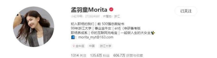 另外,查询孟羽童社交媒体发现,其账号标签上仍写着“前 500强总裁秘书”。