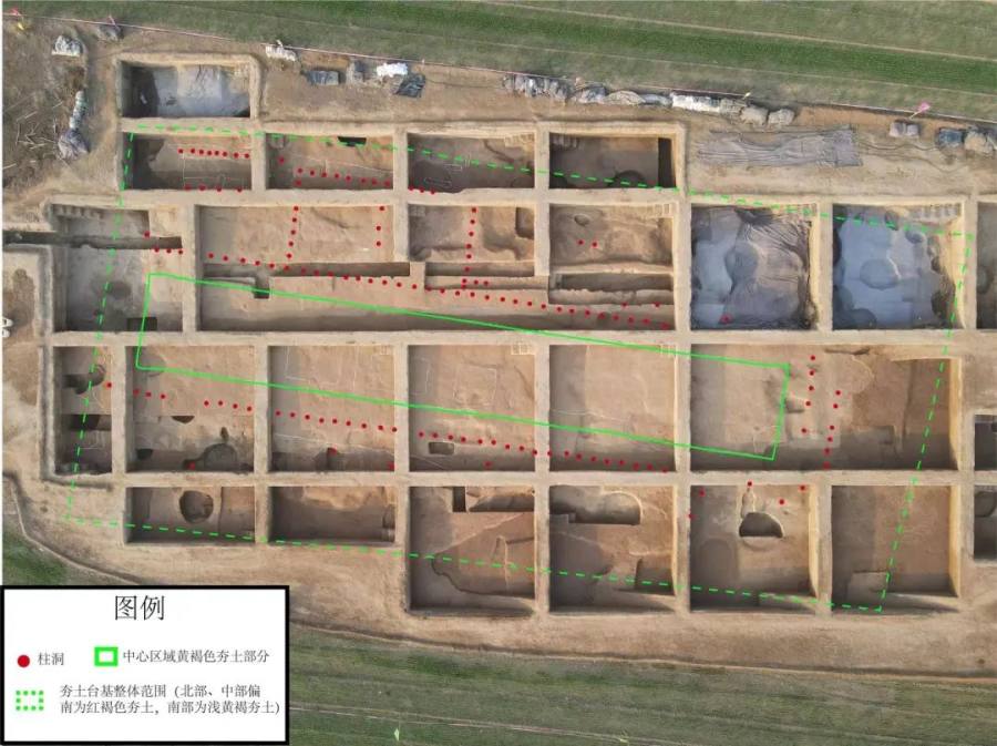 在1号夯土台基东侧,考古人员还发现一处夯土遗迹,目前已揭露部分南北长25米、东西宽约10米,与1号夯土台基应为同一组建筑。