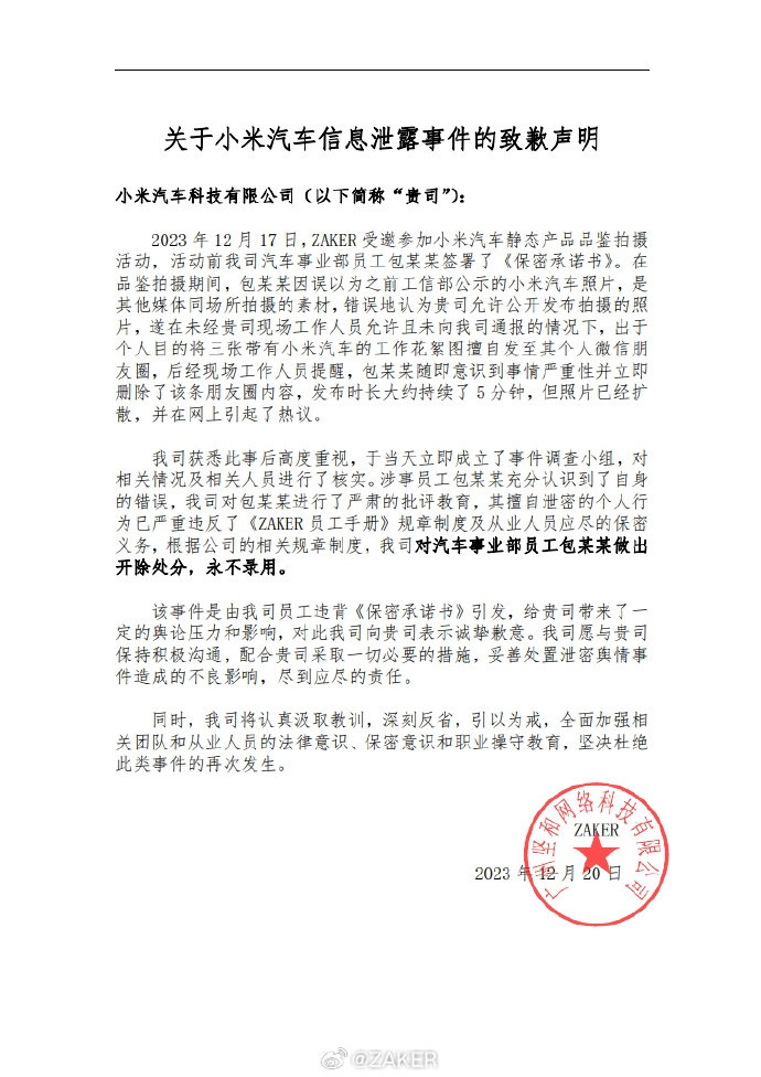 12月20日,ZAKER发布关于小米汽车信息泄露事件的致歉声明,对此事做出回应: