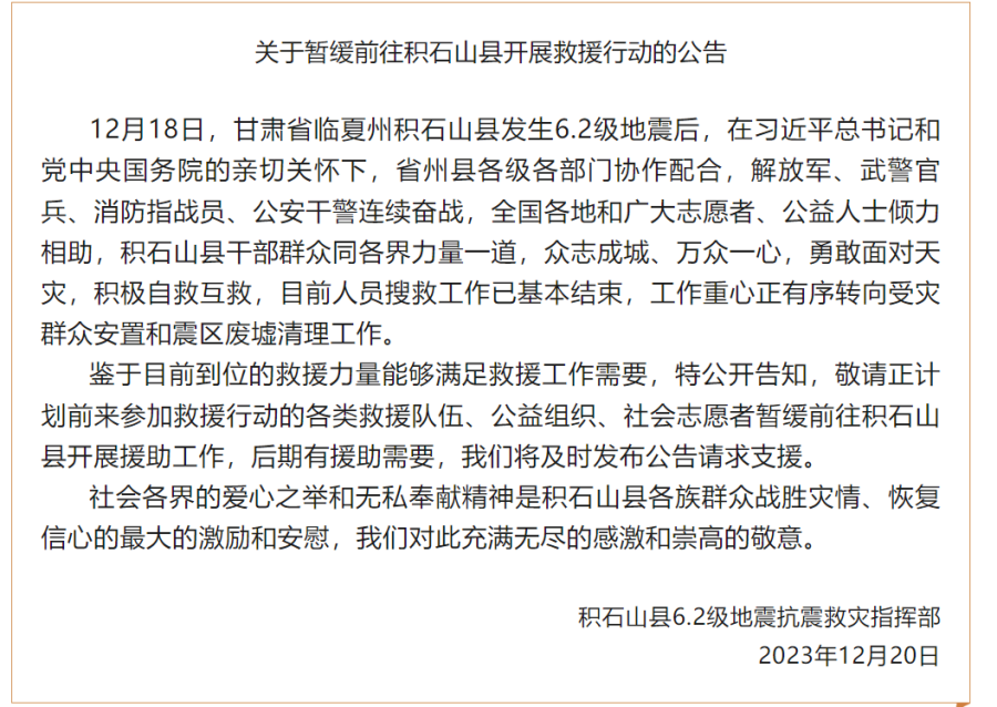 鉴于目前到位的救援力量能够满足救援工作需要,特公开告知,敬请正计划前来参加救援行动的各类救援队伍、公益组织、社会志愿者暂缓前往积石山县开展援助工作,后期有援助需要,我们将及时发布公告请求支援。
