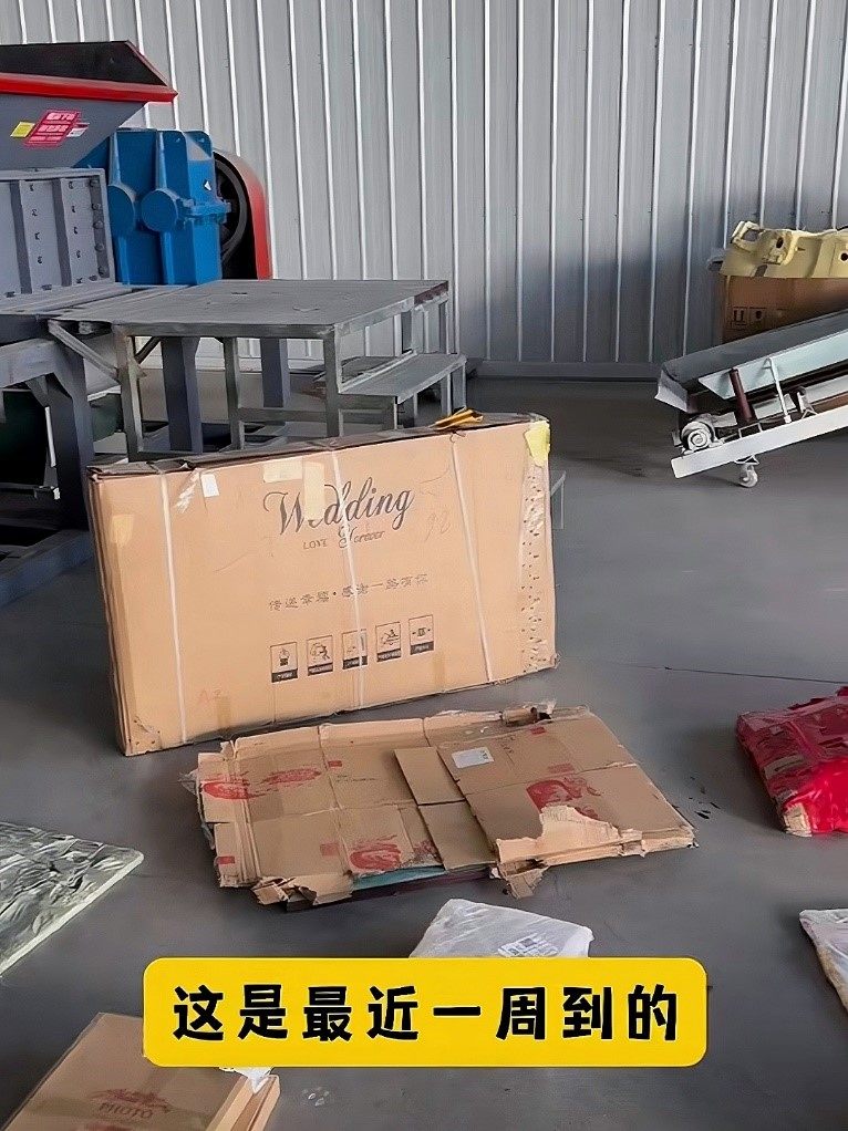 位于河北廊坊的一家厂房,机器轰鸣声在一片静谧雪色里响起,泛着银光的齿轮慢慢碾过一米多高的亚克力油画框、近十公分厚的木制相册、大小形态不一的各样手工摆件。两侧密布的钢刀缓缓向中间旋转、挤压,顷刻间便将破裂的婚纱照吞没。