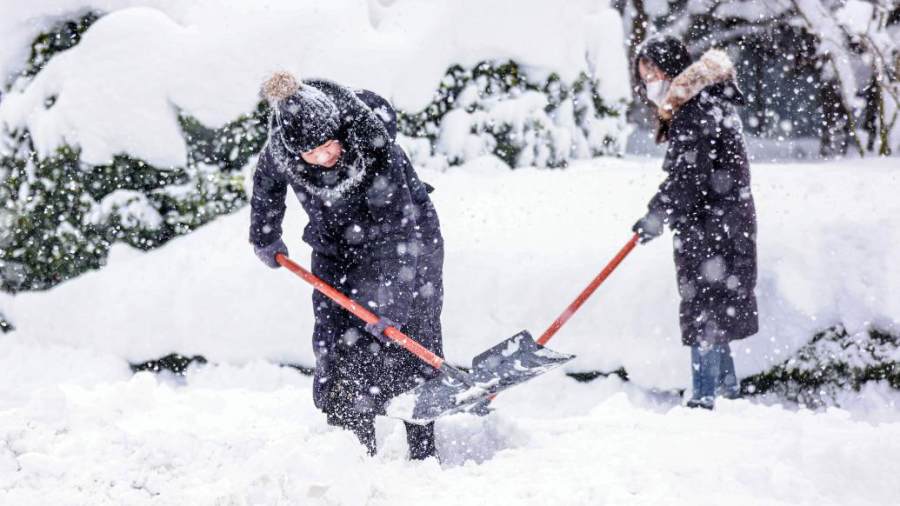 2023年12月21日,山东烟台,市民在街头铲雪。视觉中国 图