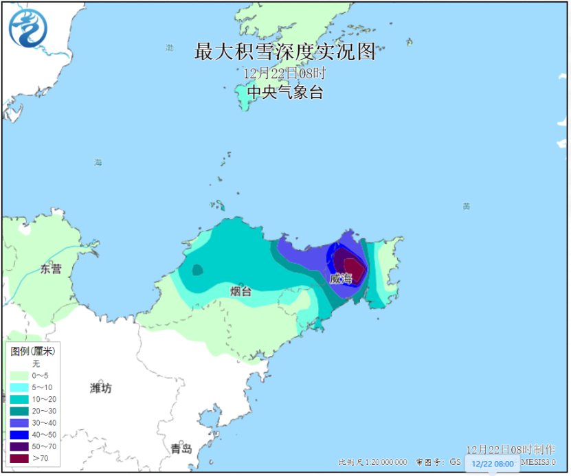 据中央气象台12月22日早上发布的消息,昨日,山东半岛出现小到中雪,山东威海局地暴雪(14~18毫米)。12月22日早晨,威海文登站积雪深度达74厘米,继续打破了昨日创造的建站以来的积雪深度纪录(55厘米),预计22日白天到夜间,山东半岛的降雪将会逐渐减弱,局地有小到中雪。