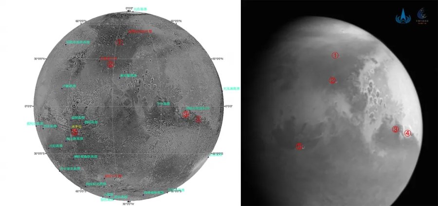 图中,火星阿茜达利亚平原、克律塞平原、子午高原、斯基亚帕雷利坑以及最长的峡谷—水手谷等标志性地貌清晰可见。