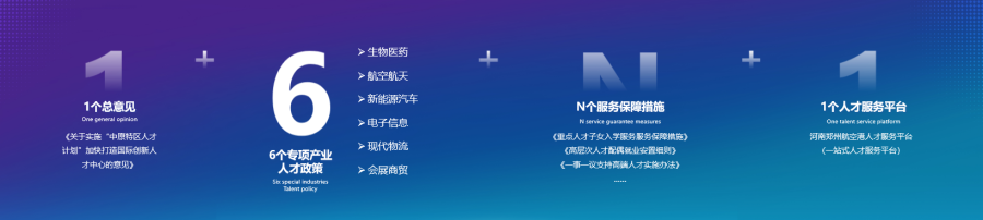 据悉,“中原特区人才计划”坚持突出产业、突出贡献、突出实效、突出服务的原则,构建“1+6+N+1”政策体系,创新提出《关于实施“中原特区人才计划”加快打造国际创新人才中心的意见》,按照“一产业一政策”原则,围绕生物医药、航空航天、新能源汽车、电子信息、现代物流、会展商贸等6个主导产业出台产业人才集聚措施。