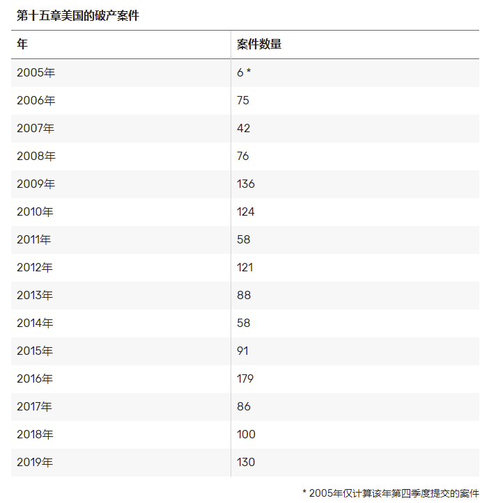 数据显示,截至2019年底,2009年、2016年和2019年提交的第Chapter 15破产案件数量最多。在2020年春季,许多外国公司因新冠疫情受困也纷纷申请第15章破产,如法国媒体公司Technicolor SA、加拿大茶叶经销商DAVIDsTEA、澳大利亚航空公司维珍澳大利亚航空、加拿大马戏团太阳马戏团娱乐集团等赫然在列。