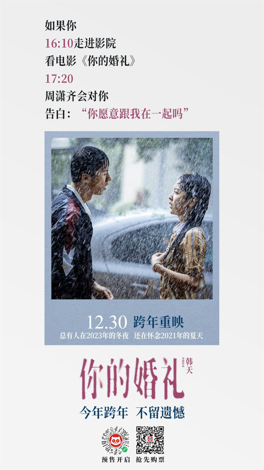 本片的营销发行上也为情侣们准备了一些小心机,比如选在12月31日22:15走进影院看《你的婚礼》,那么则会在新年零点时分听到主演许光汉说出“谢谢你,出现在我的生命中”;如果在下午4:10走进影院,则会在下午5:20听到许光汉的告白,“你愿意跟我在一起吗?”目前该片预售已超700万。