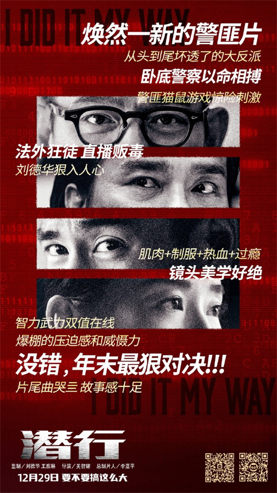 华仔在《金手指》里的憋屈,在《潜行》里可以狠狠释放了。这部电影里,他是一位藏得很深的优雅反派,“货品交易不经手,杀人害命不沾血,犯案不留蛛丝马迹”。这也是继2007年上映的电影《门徒》后,刘德华时隔16年再演反派,片中他携“暗网”、“直播贩毒”等新手段归来,在港片的老套路中,加入当下的新元素,带给观众酣畅体验的同时,也为大家敲响警钟。