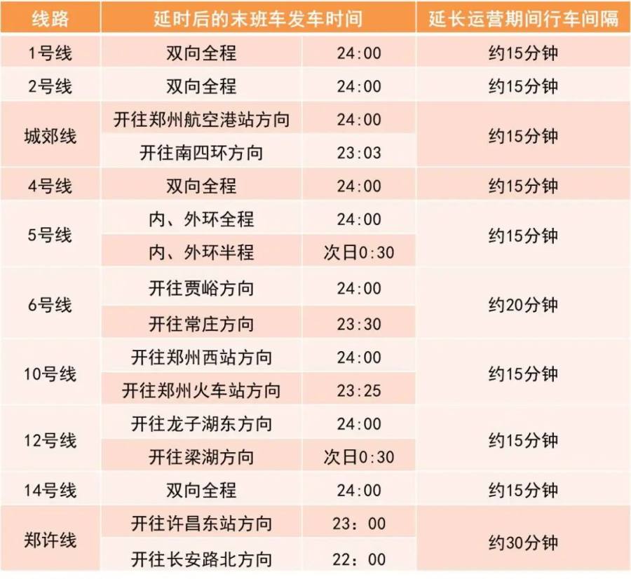 郑州地铁结合线网客流特点,节前一天及元旦假期(12月29日~1月1日),地铁线网总体延长至次日0:00,延长期间行车间隔约15至30分钟。具体详见下图:
