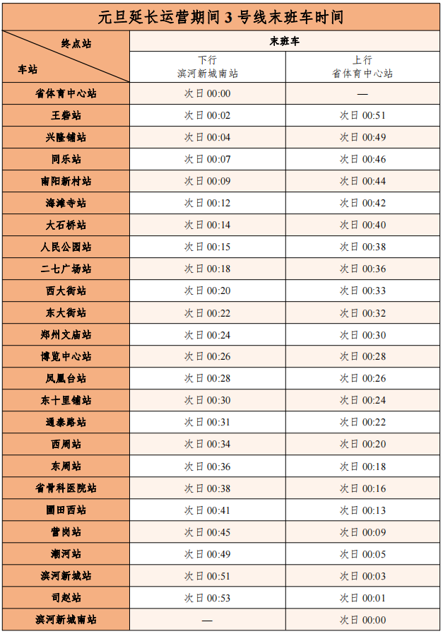 2023年12月29日至2024年1月1日,郑州中建深铁3号线延长运营服务时间至24时,“橙跑计划”半程末班车取消。延长运营后,3号线省体育中心站/滨河新城南站末班车发车时间为24时。