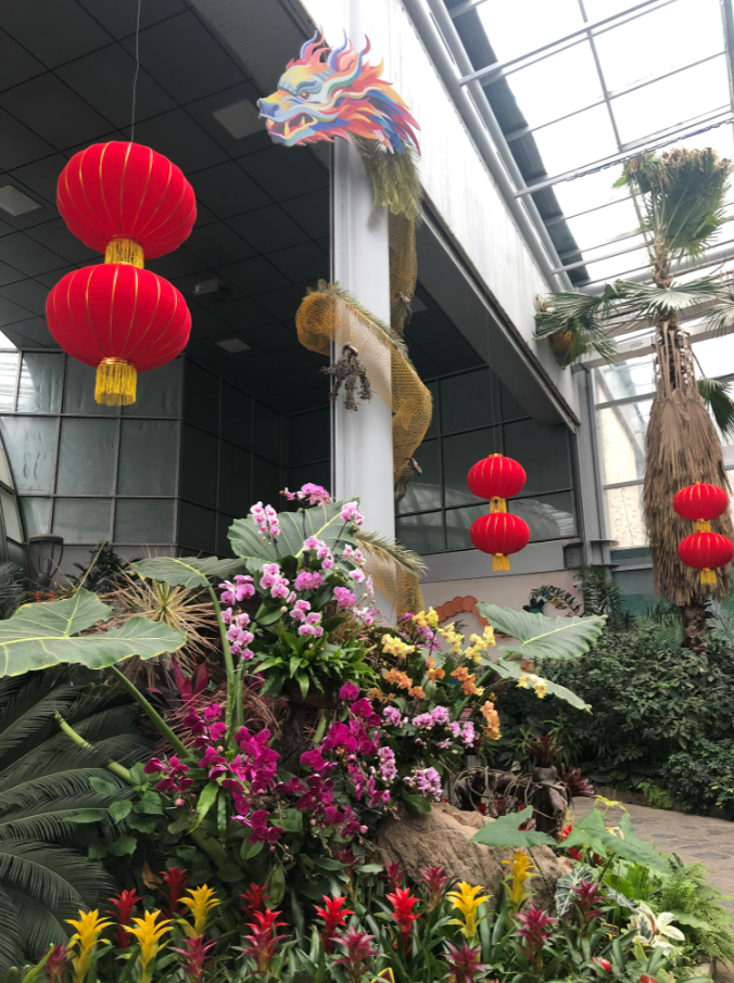 本次花展以“龙腾花海喜迎春 ”为主题,将植物文化与生肖文化巧妙结合,设置“龙腾盛世”“龙翔花海”“飞龙在天”“龙的传人”四个展示区,营造了祥和、热闹的新春氛围,共展示蝴蝶兰、文心兰、大花蕙兰、黄金春羽等特色热带花卉80余种、约2000余株。其中,“龙腾盛世”用鲜艳喜庆的中国红、金色线条将双龙描摹得栩栩如生,在蝴蝶兰、杜鹃、绣球等特色花卉的映衬下,令人仿佛置身于仙境;“龙翔花海”用细网做身、铁树叶片做脊背、鱼尾葵的花序做爪制作成一条金龙,腾跃于蝴蝶兰等形成的花海之上,妙趣横生,彰显节约、环保的绿色理念;科普中心区在娇艳的花丛中设置“龙船”,吸引不少游客拍照打卡,让游客入景、入境,氛围感十足,体验感满满。