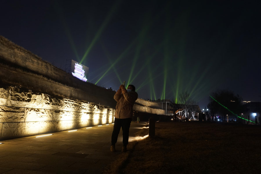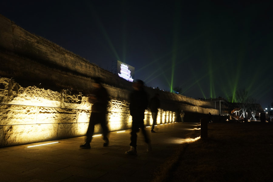 管城商代古城墙西南角处也被称为夕阳楼片区,在跨年文化活动的夜晚,除了重现夕阳楼古人登城演绎千古绝句的场景之外,在城墙上西南侧,还通过投影映出了“我在管城街角,遇见商都故事”“巍巍亳都星汉灿烂,千年根脉王都典范”“穿越夏商三千年,感受古都郑新生”等立体字样,在西侧的南顺城街,路上灯火璀璨,树梢上悬挂着各种新年祝福的寄语灯串,迎接2024新年的氛围感充满了整个街道,南顺城街上的时光记忆馆也吸引了不少市民前往参观,大街上市民纷纷拿出手机在这里打卡驻足,感受着现代和商代古都文化交融的魅力。