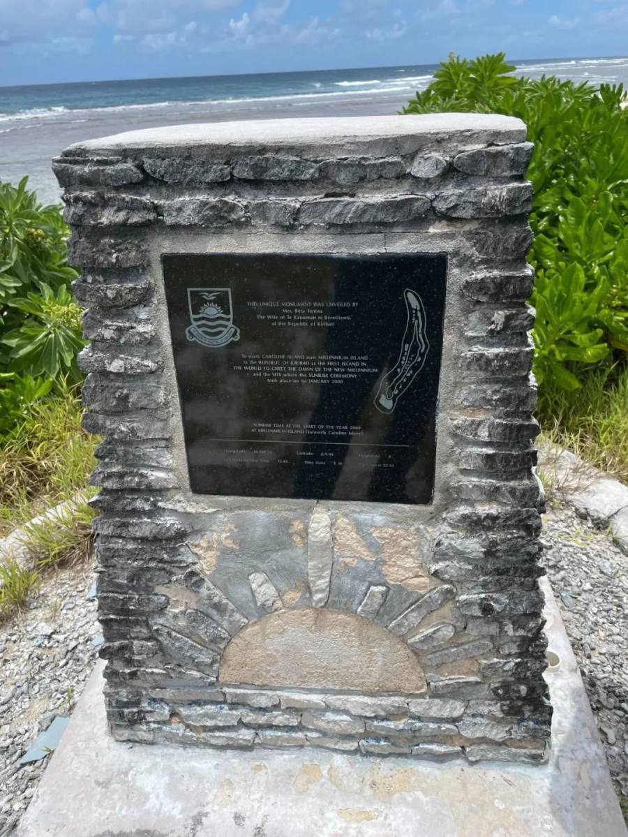 1997年基里巴斯将位于东14区无人居住的卡罗琳岛改“千禧年岛”,以吸引国际游客。图为位于圣诞岛一家酒店的千禧年岛纪念碑。陈效卫摄