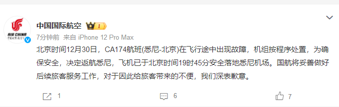 北京时间12月30日,CA174航班(悉尼-北京)在飞行途中出现故障,机组按程序处置,为确保安全,决定返航悉尼,飞机已于北京时间19时45分安全落地悉尼机场。国航将妥善做好后续旅客服务工作,对于因此给旅客带来的不便,我们深表歉意。