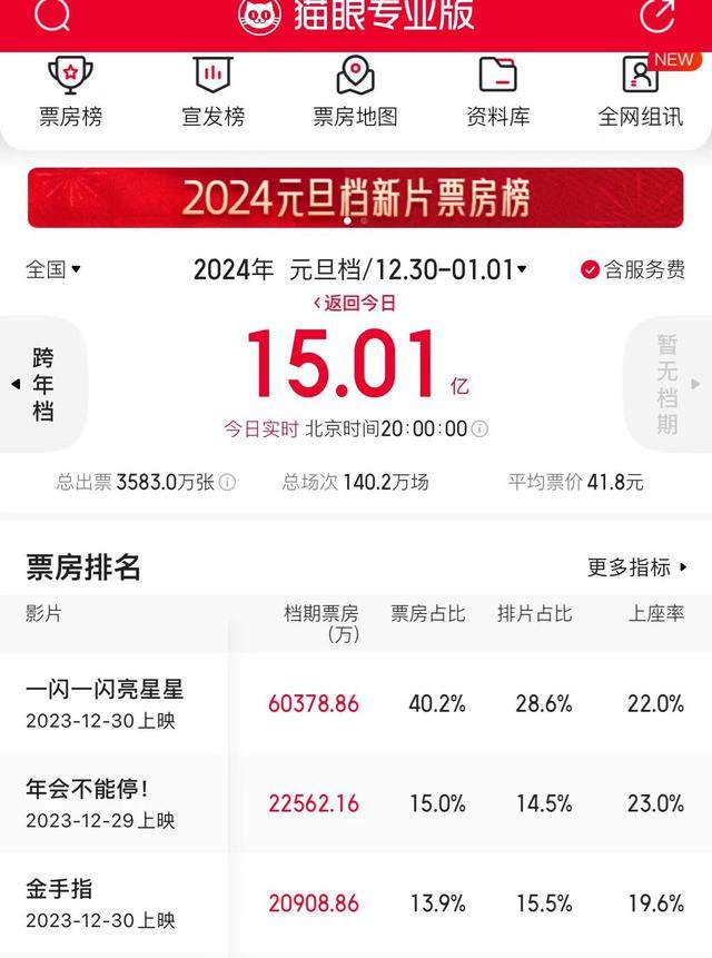 猫眼专业版数据显示,2023年12月29日上映的电影《年会不能停!》及2023年12月30日上映的《一闪一闪亮星星》《金手指》元旦档期票房位居前三,且均超2亿元。