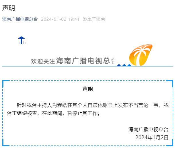1月2日,海南广播电视台发布声明称,针对主持人肖程皓在其个人自媒体账号上发布不当言论一事,该台正组织核查,在此期间,暂停止其工作。
