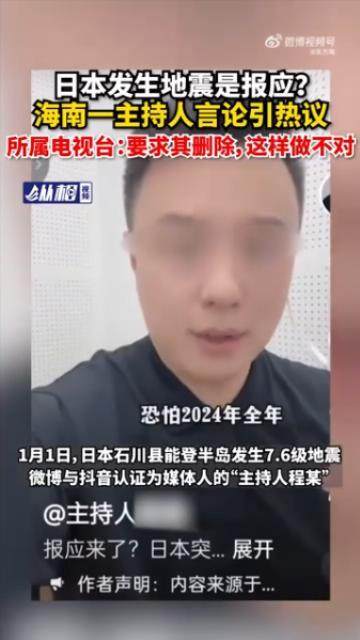 据媒体此前报道,1月1日,日本石川县能登半岛发生7.6级地震。当天,微博与抖音认证为媒体人的“主持人程某”发布视频称“报应来了?日本突发7.4级地震!”,该视频引起网民热议。据公开信息,“主持人程某”为海南广播电视总台主播。