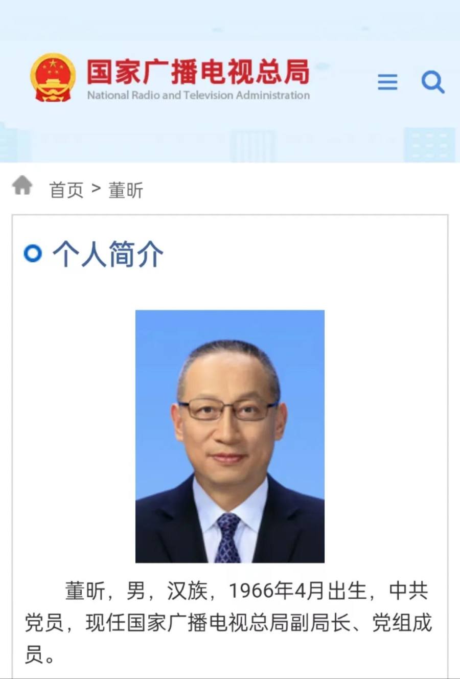 国家广播电视总局官网信息显示,董昕已任国家广播电视总局副局长、党组成员。