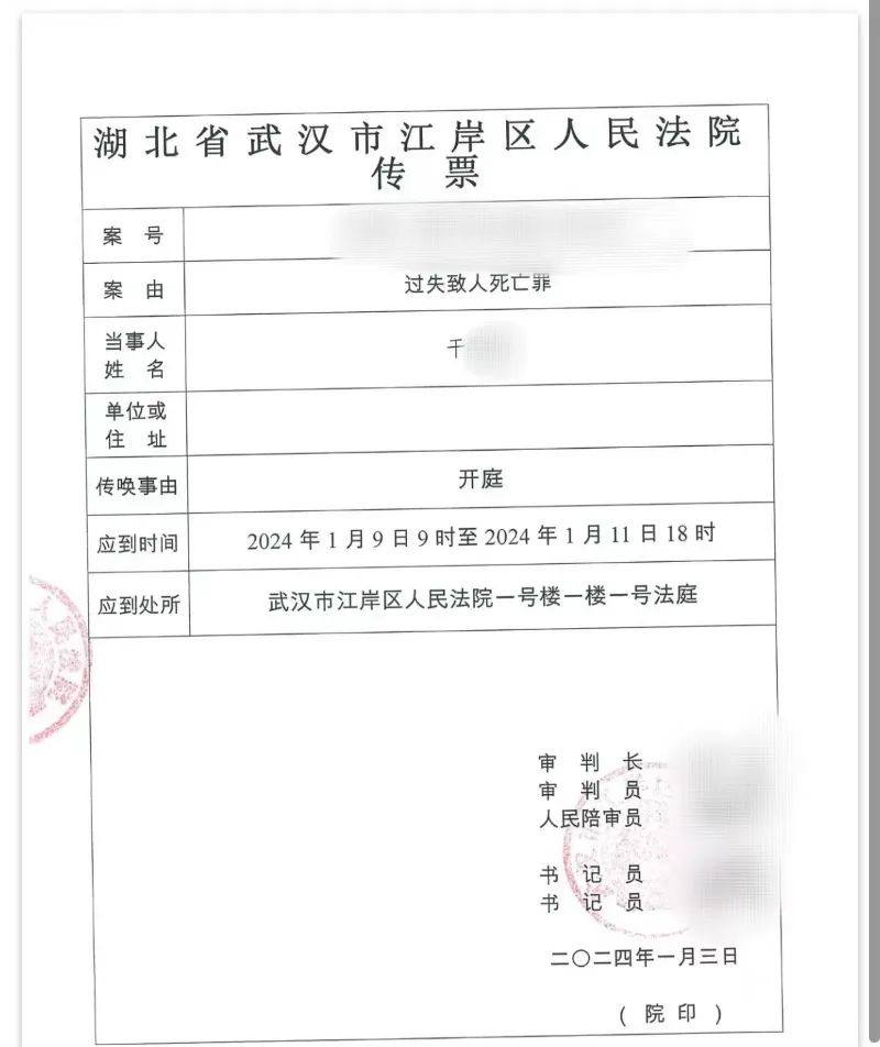 记者从法院传票显示,该案案由是“过失致人死亡罪”,庭审将持续三天时间,1月9日9时至1月11日18时。