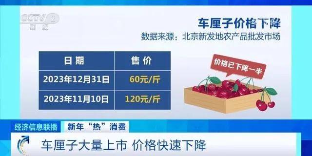 据央视财经报道,随着进口车厘子大量上市,价格出现明显下降。北京新发地批发市场的统计数据显示,2023年12月31日,智利进口车厘子平均售价为每斤60元,相较于2023年11月10日平均价每斤120元,价格已下降一半,销量也大幅增加。