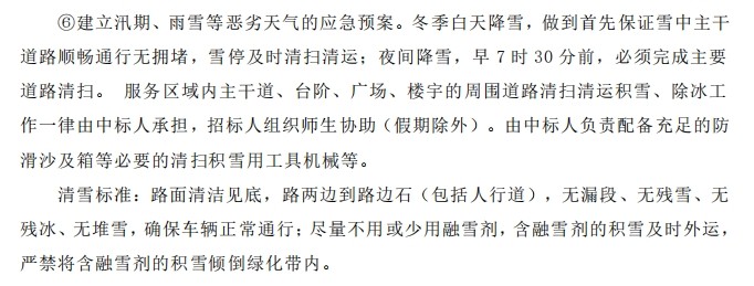 天眼查显示,招标文件中的校园环境保洁服务要求指出,服务区域内主干道、台阶、广场、楼宇的周围道路清扫清运积雪、除冰工作一律由中标人承担。