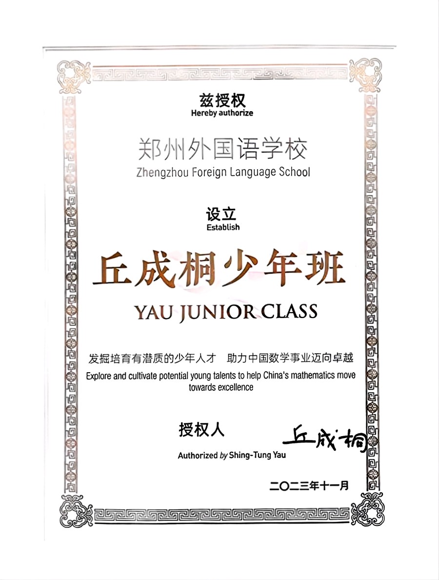 郑州外国语学校数学拔尖创新人才培养机制和成果得到丘成桐先生高度认可,经层层考核,丘成桐先生授权郑州外国语学校设立“丘成桐少年班”。郑州外国语学校将在新一轮数理学科拔尖创新人才培养探索与实践中,探寻数理学科基础教育与高等教育贯通培养路径,不断培养对数理学科充满热爱的优秀学子。