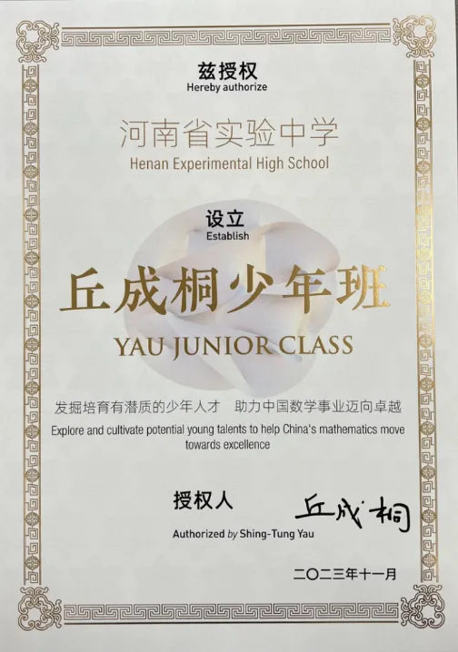 2023年11月,在河南省教育厅大力支持下,河南省实验中学致函丘成桐先生,申请设立“丘成桐少年班”,之后得到丘成桐先生复函,同意并授权学校设立“丘成桐少年班”。据了解,丘成桐先生将担任“丘成桐少年班”总顾问,负责全面指导、规划总体培养计划,定期与学校及相关教育部门交流,了解人才培养进展。