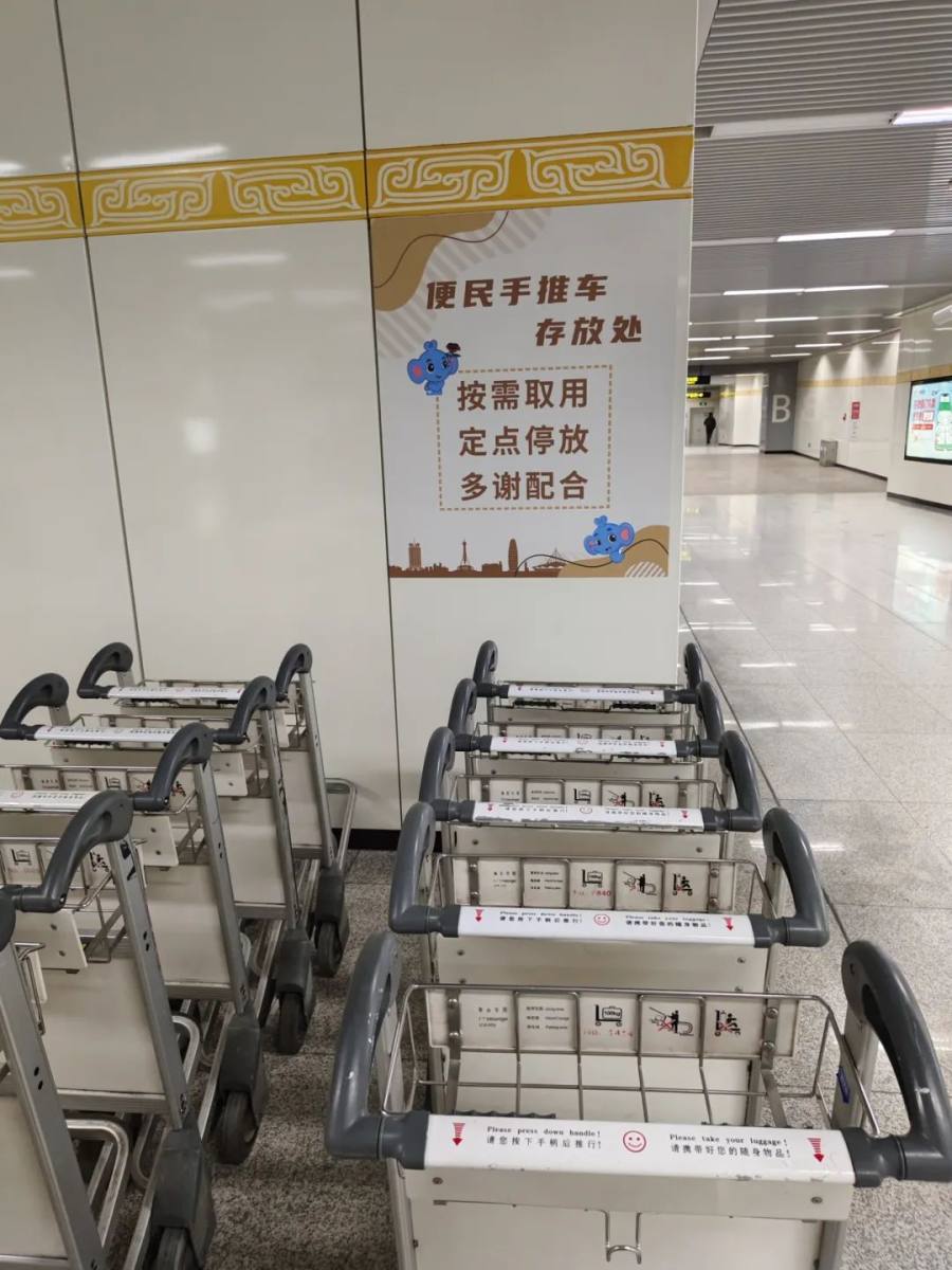 携带大件行李、多件行李的乘客,还可在“一站式服务区”取用便民行李小推车,轻松解决大件小件不易携带和搬运的问题。