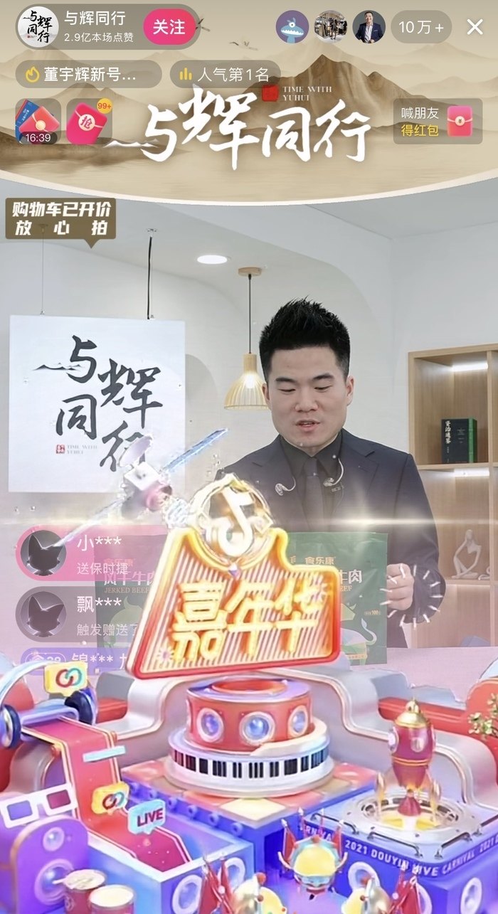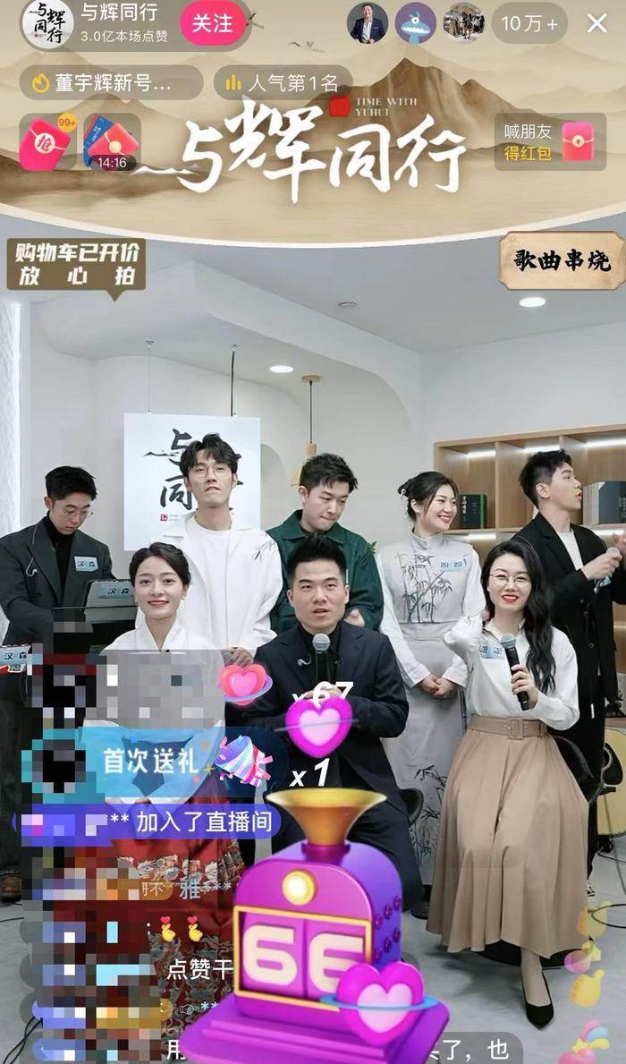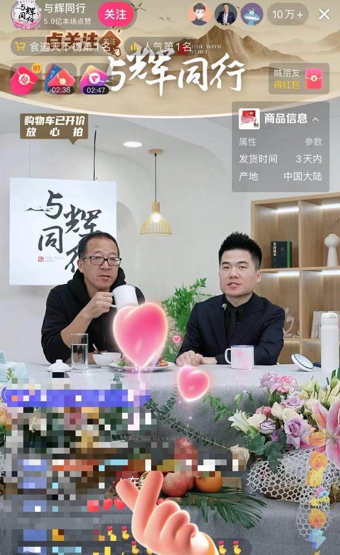 首次开播,直播间每20分钟进行一轮抽奖,奖品是之前被董宇辉卖爆的签名版《额尔古纳河右岸》以及888元现金红包。开播三分钟,点赞量超过3000万。开播5分钟内,与辉同行账号粉丝数由415.2万涨至420.2万。