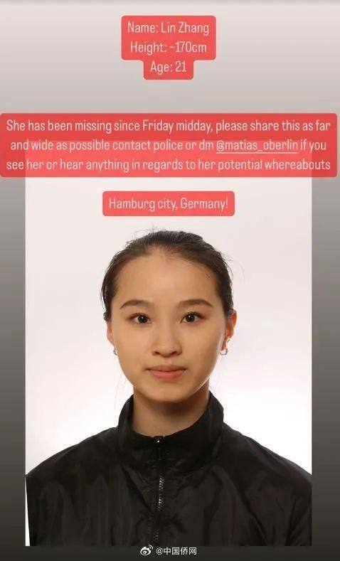 德国汉堡芭蕾舞团首席芭蕾舞演员Matias Oberlin近日在社交媒体平台发布寻人启事称,汉堡芭蕾舞团一名中国女芭蕾舞演员失踪。寻人启事称,该名失踪女演员名为“Lin Zhang”,21岁,最后一次出现是在上周五(1月5日)中午。