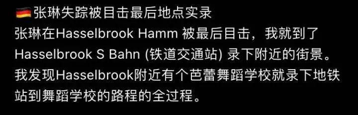 目前警方仍未更新最新信息。家人也未公开发布寻人求助。关于张琳失踪的消息,最早是由汉堡芭蕾舞团首席舞者Matias Oberlin在自媒体Instagram上发布,后来舞团成员纷纷转发,在主要的芭蕾论坛上也出现了寻人启事,许多看到的芭蕾舞者帮忙扩散。