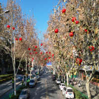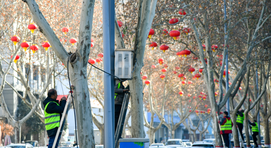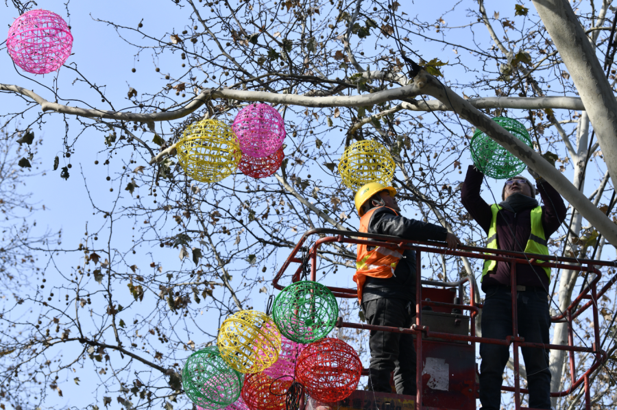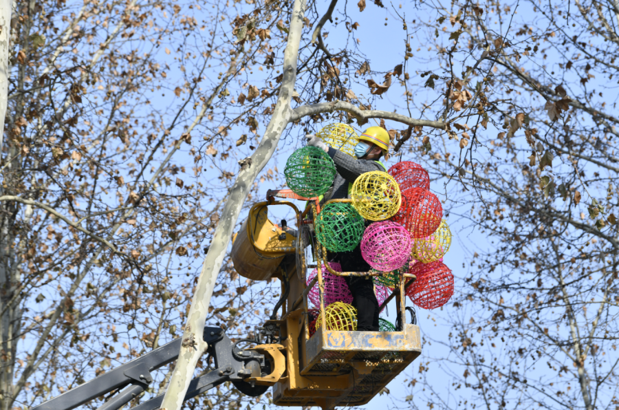高高挂起的红灯笼、大大小小的彩色灯球……1月10日,伊河路上工人们正紧锣密鼓地将彩色藤球灯悬挂在行道树上,为即将到来的双节营造喜庆氛围。