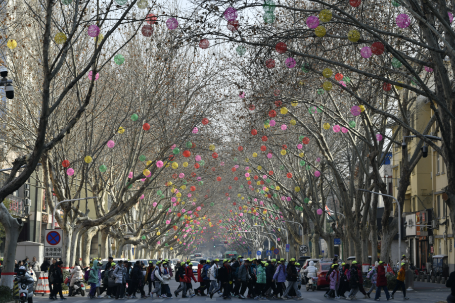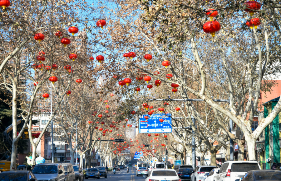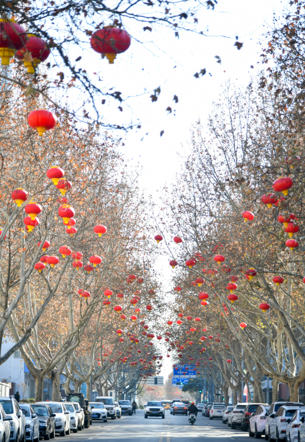 华山路两旁的法桐树上挂满了大红灯笼。徐宗福 图