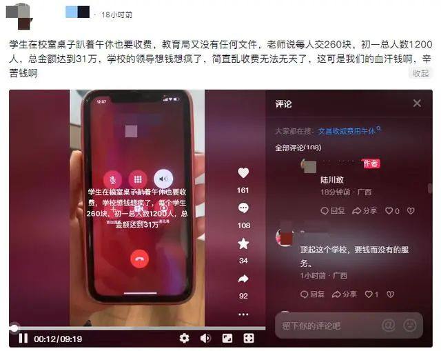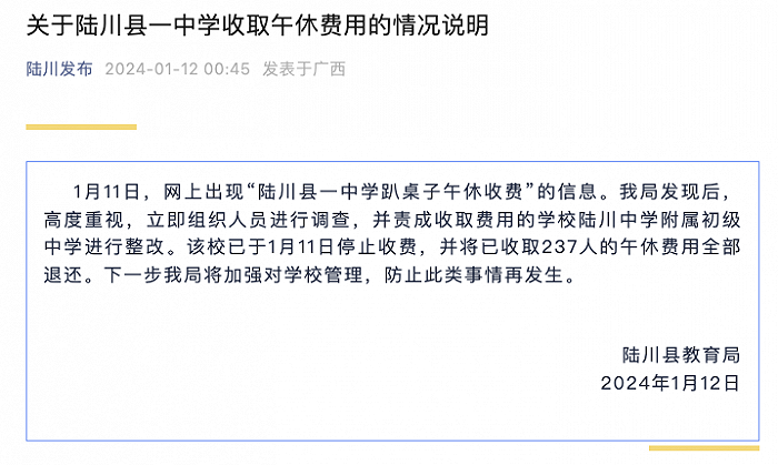 记者从广西陆川县教育局获悉,1月11日,关于网上出现“陆川县一中学趴桌子午休收费”的情况,陆川县立即组织人员进行调查,并责成收取费用的学校陆川中学附属初级中学进行整改。该校已于1月11日停止收费,并将已收取237人的午休费用全部退还。陆川县教育局表示,下一步将加强对学校管理,防止此类事情再发生。