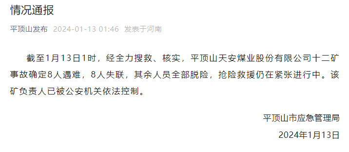 截至1月13日1时,经全力搜救、核实,平顶山天安煤业股份有限公司十二矿事故确定8人遇难,8人失联,其余人员全部脱险,抢险救援仍在紧张进行中。该矿负责人已被公安机关依法控制。
