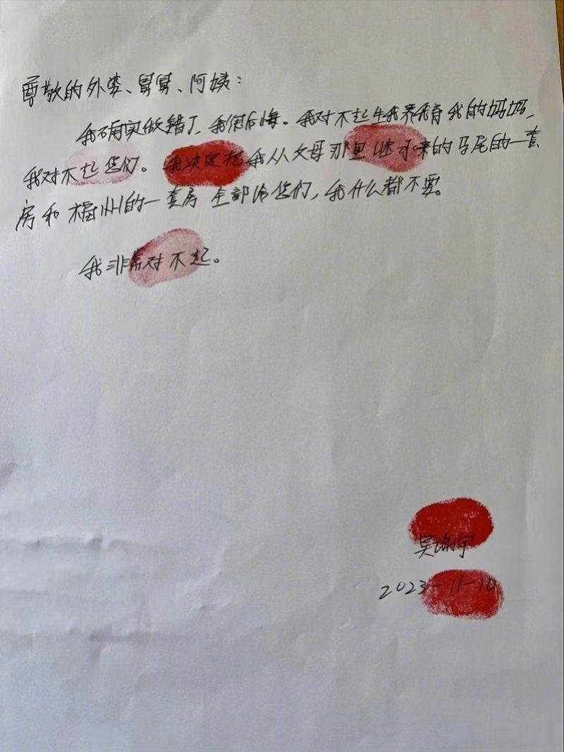 吴谢宇在道歉信中写道,“尊敬的外婆、舅舅、阿姨,我确实做错了,我很后悔,我对不起生我养我育我的妈妈,我对不起您们,我决定把我从父母那里继承来的马尾的一套房和福州的一套房全部给您们,我什么都不要,我非常对不起。”